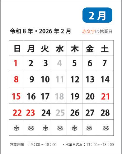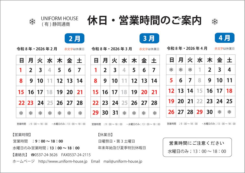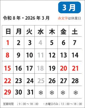 1月・2月・3月の営業時間・休業日・特別休暇のご案内