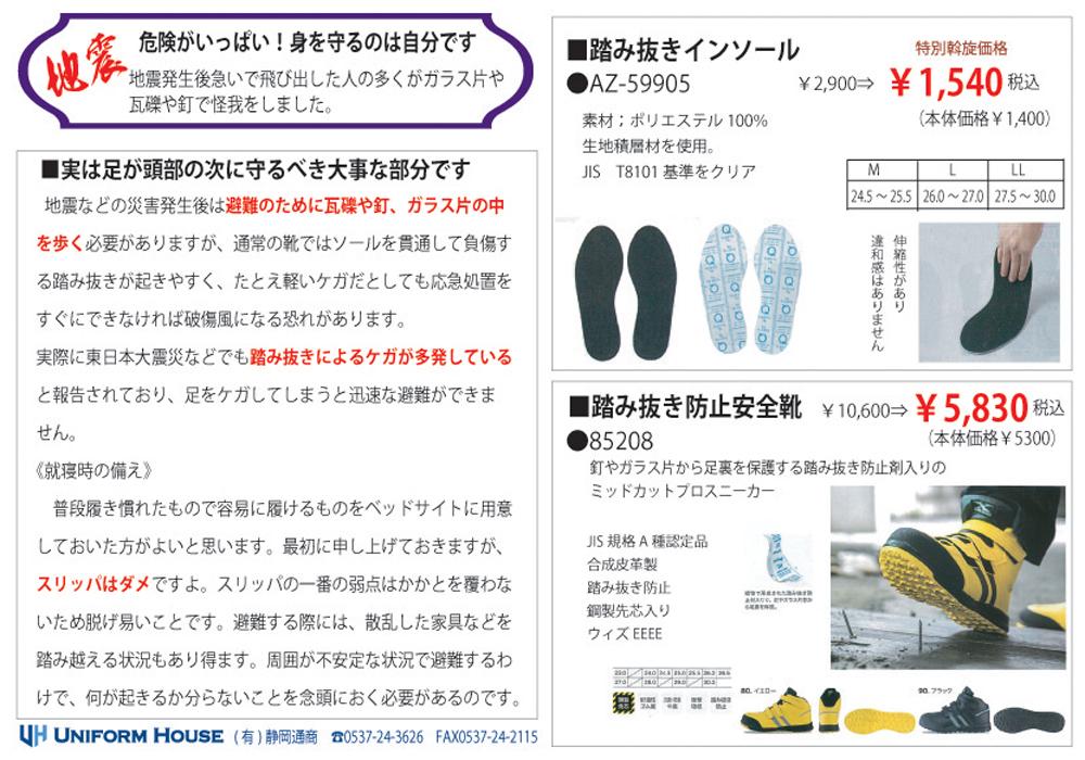踏み抜き防止インソールでガラス片などの踏み抜きを防止します!M~LL ¥2.900 ⇒ ¥1,540税込 お問い合わせ先(有)静岡通商☎0537-24-3626 FAX0537-24-2115 |